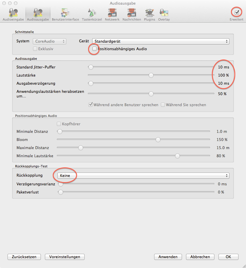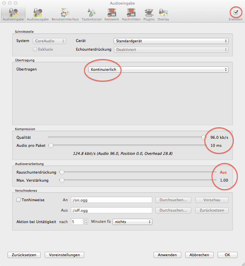 Bei der Installation von Mumble sollten alle Assistenten weggeklickt werden. Die Einstellungen sind für Podcasts leider nicht zu gebrauchen. Bitte stattdessen folgende Einstellungen vornehmen:
